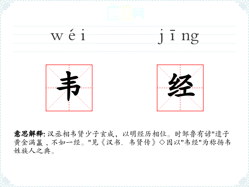 汉丞相韦贤少子玄成,以明经历相位。时邹鲁有谚"遗子黄金满籯﹐不如一经。"见《汉书.韦贤传》◇因以"韦经"为称扬韦姓族人之典。