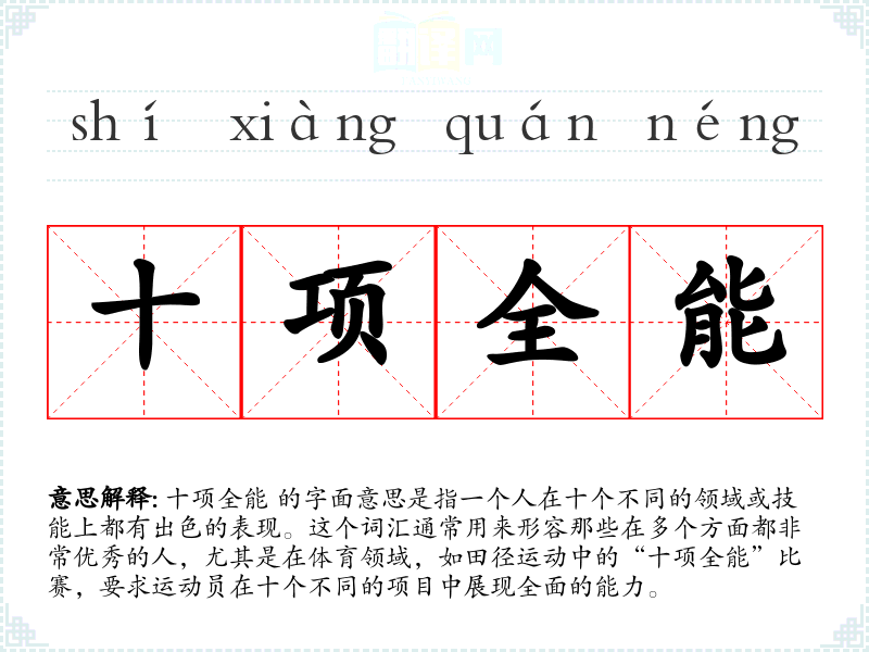 十项全能 的字面意思是指一个人在十个不同的领域或技能上都有出色的表现。这个词汇通常用来形容那些在多个方面都非常优秀的人,尤其是在体育领域,如田径中的“十项全能”比赛,要求员在十个不同的项目中展现全面的能力。