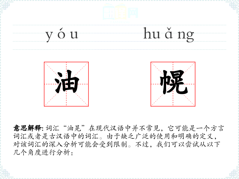 词汇“油晃”在现代汉语中并不常见,它可能是一个方言词汇或者是古汉语中的词汇。由于缺乏广泛的使用和明确的定义,对该词汇的深入分析可能会受到限制。不过,我们可以尝试从以下几个角度进行分析: