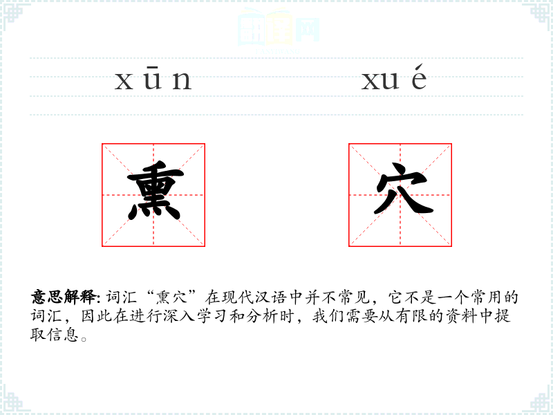 由于“熏穴”不是一个常用词汇,它在现代文学、口语或专业领域中很少出现。如果出现,可能是在描述某些传统工艺、考古发现或历史文献中。