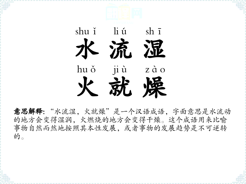 “水流湿,火就燥”是一个汉语成语,字面意思是水流动的地方会变得湿润,火燃烧的地方会变得干燥。这个成语用来比喻事物自然而然地按照其本性发展,或者事物的发展趋势是不可逆转的。