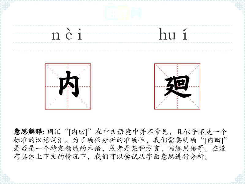 词汇“[内回]”在中文语境中并不常见,且似乎不是一个标准的汉语词汇。为了确保分析的准确性,我们需要明确“[内回]”是否是一个特定领域的术语,或者是某种方言、网络用语等。在没有具体上下文的情况下,我们可以尝试从字面意思进行分析。