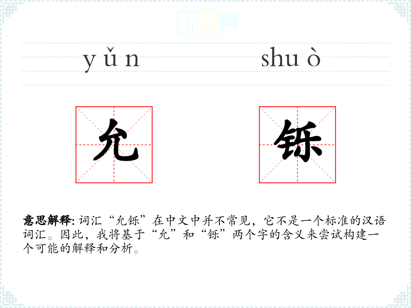 词汇“允铄”在中文中并不常见,它不是一个标准的汉语词汇。因此,我将基于“允”和“铄”两个字的含义来尝试构建一个可能的解释和分析。