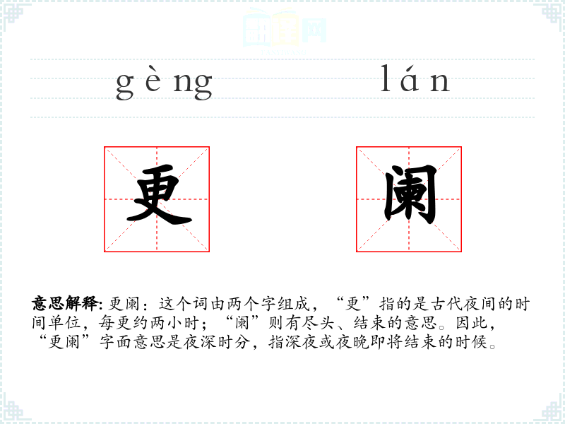 文学语境:在古典文学中,“更阑”常用来描绘夜晚的静谧或人物的孤独,如“更阑人静”。