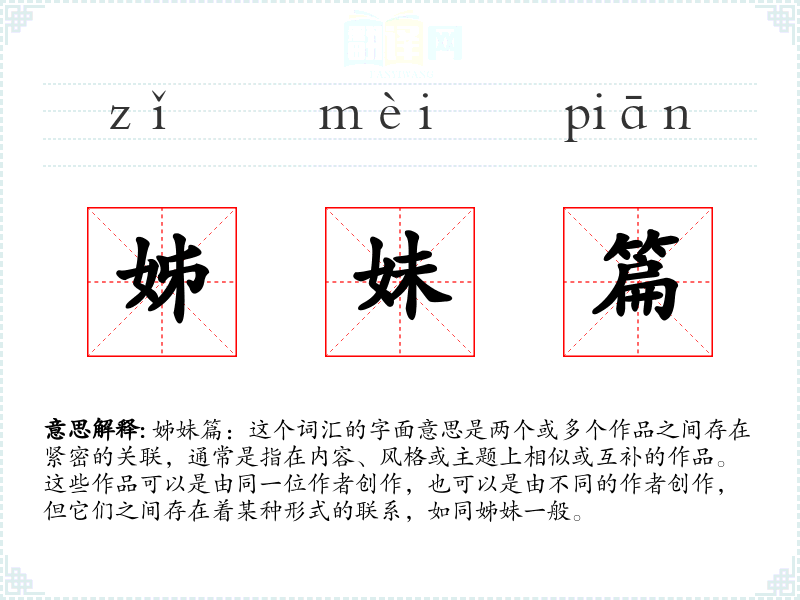 姊妹篇这个词汇源自中文,直接翻译为“sister works”或“companion pieces”。在古代文学中,由于作品之间的相互引用和影响,这个词逐渐被用来描述那些在内容或形式上有关联的作品。