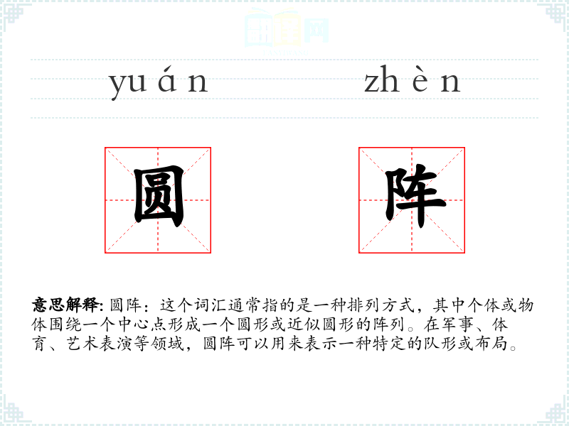 圆阵:这个词汇通常指的是一种排列方式,其中个体或物体围绕一个中心点形成一个圆形或近似圆形的阵列。在军事、体育、艺术表演等领域,圆阵可以用来表示一种特定的队形或布局。