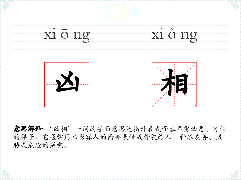 “凶相”一词的字面意思是指外表或面容显得凶恶、可怕的样子。它通常用来形容人的面部表情或外貌给人一种不友善、威胁或危险的感觉。