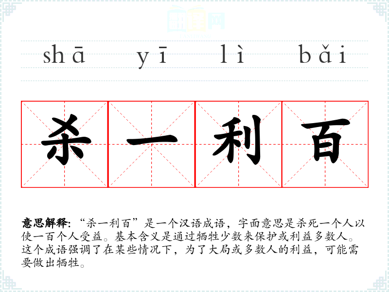 “杀一利百”是一个汉语成语,字面意思是杀死一个人以使一百个人受益。基本含义是通过牺牲少数来保护或利益多数人。这个成语强调了在某些情况下,为了大局或多数人的利益,可能需要做出牺牲。