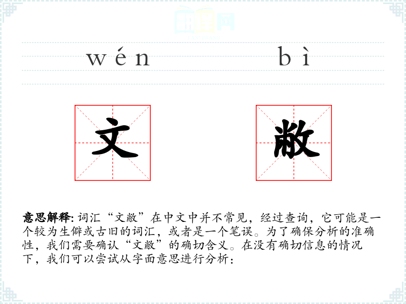 词汇“文敝”在中文中并不常见,经过查询,它可能是一个较为生僻或古旧的词汇,或者是一个笔误。为了确保分析的准确性,我们需要确认“文敝”的确切含义。在没有确切信息的情况下,我们可以尝试从字面意思进行分析: