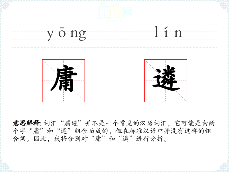 词汇“庸遴”并不是一个常见的汉语词汇,它可能是由两个字“庸”和“遴”组合而成的,但在标准汉语中并没有这样的组合词。因此,我将分别对“庸”和“遴”进行分析。