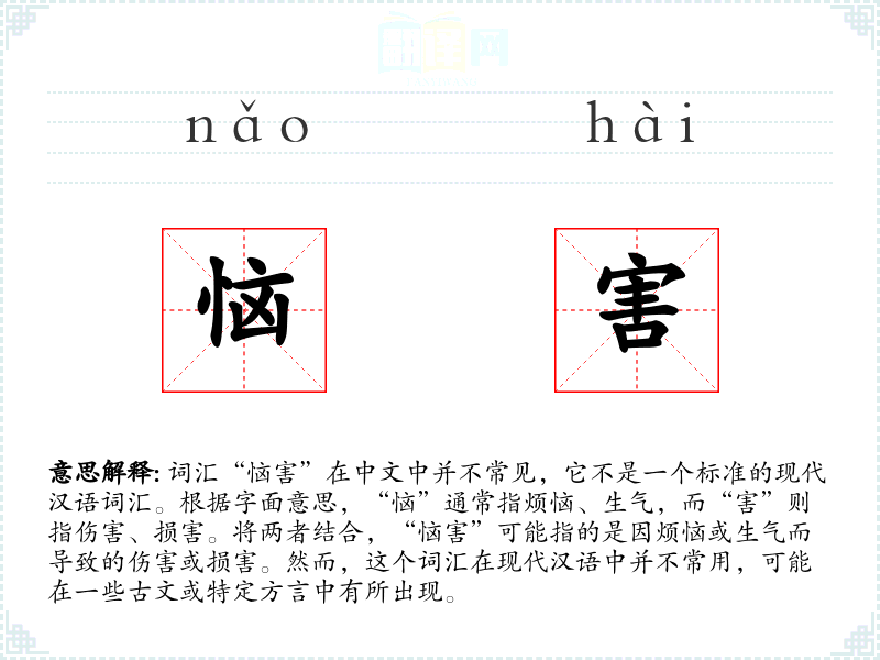 - 词源:可能源自古代汉语,结合了“恼”和“害”两个字的含义。