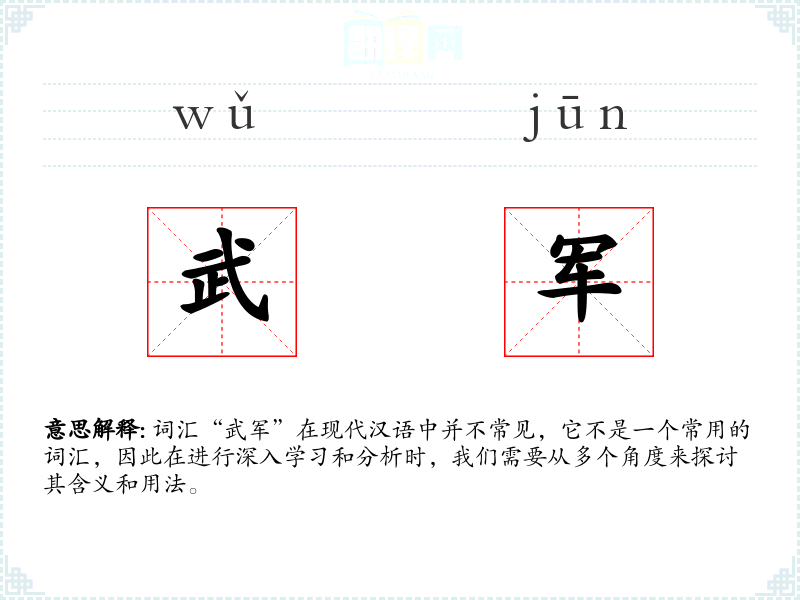词汇“武军”在现代汉语中并不常见,它不是一个常用的词汇,因此在进行深入学*和分析时,我们需要从多个角度来探讨其含义和用法。