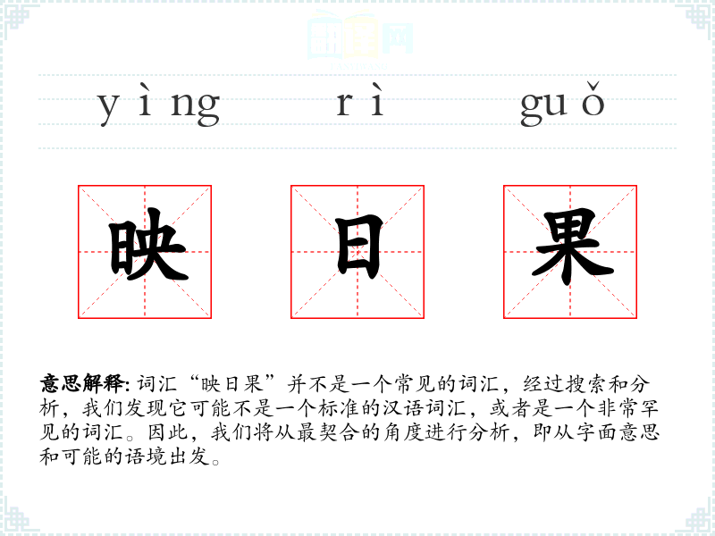 词汇“映日果”并不是一个常见的词汇,经过搜索和分析,我们发现它可能不是一个标准的汉语词汇,或者是一个非常罕见的词汇。因此,我们将从最契合的角度进行分析,即从字面意思和可能的语境出发。