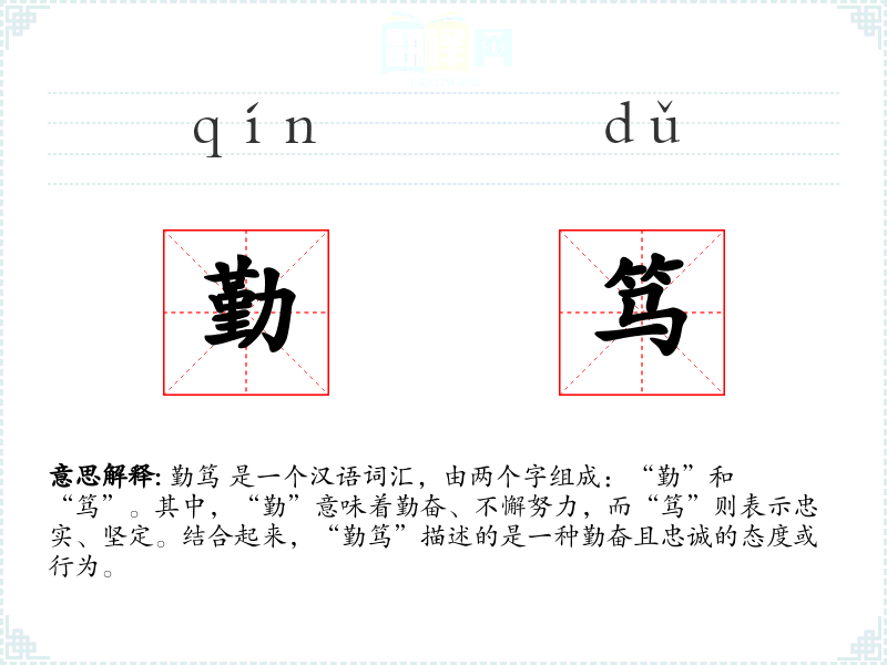 勤笃 是一个汉语词汇,由两个字组成:“勤”和“笃”。其中,“勤”意味着勤奋、不懈努力,而“笃”则表示忠实、坚定。结合起来,“勤笃”描述的是一种勤奋且忠诚的态度或行为。