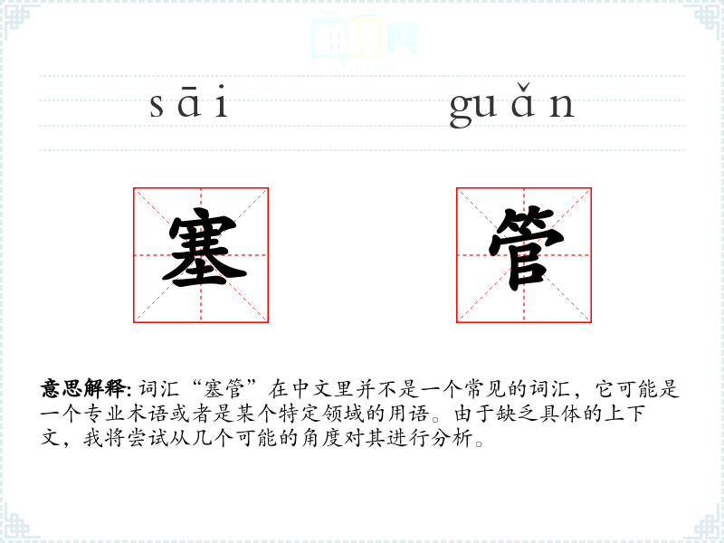 词汇“塞管”在中文里并不是一个常见的词汇,它可能是一个专业术语或者是某个特定领域的用语。由于缺乏具体的上下文,我将尝试从几个可能的角度对其进行分析。