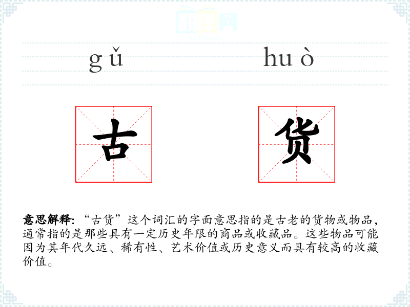 “古货”一词由“古”和“货”两个字组成。“古”字表示古老、年代久远,“货”字则指商品或物品。随着时间的推移,“古货”一词逐渐被用来特指那些具有历史价值的古老物品。