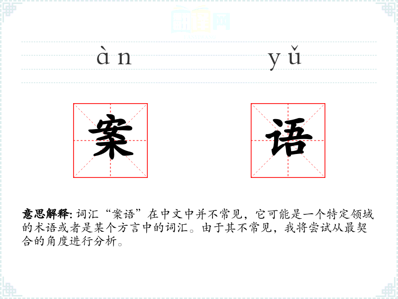 词汇“案语”在中文中并不常见,它可能是一个特定领域的术语或者是某个方言中的词汇。由于其不常见,我将尝试从最契合的角度进行分析。