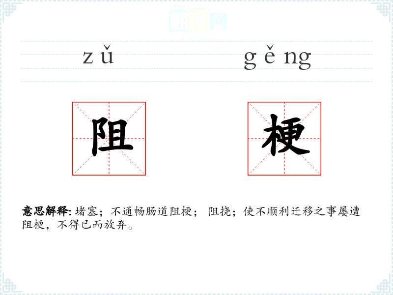 堵塞;不通畅肠道阻梗; 阻挠;使不顺利迁移之事屡遭阻梗,不得已而放弃。