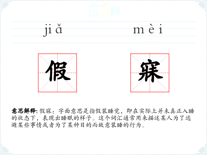 假寐:字面意思是指假装睡觉,即在实际上并未真正入睡的状态下,表现出睡眠的样子。这个词汇通常用来描述某人为了逃避某些事情或者为了某种目的而故意装睡的行为。
