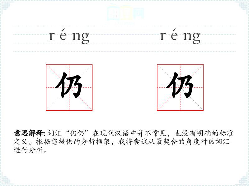 词汇“仍仍”在现代汉语中并不常见,也没有明确的标准定义。根据您提供的分析框架,我将尝试从最契合的角度对该词汇进行分析。
