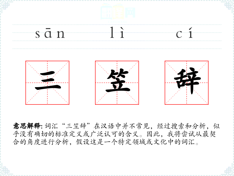 词汇“三笠辞”在汉语中并不常见,经过搜索和分析,似乎没有确切的标准定义或广泛认可的含义。因此,我将尝试从最契合的角度进行分析,假设这是一个特定领域或文化中的词汇。