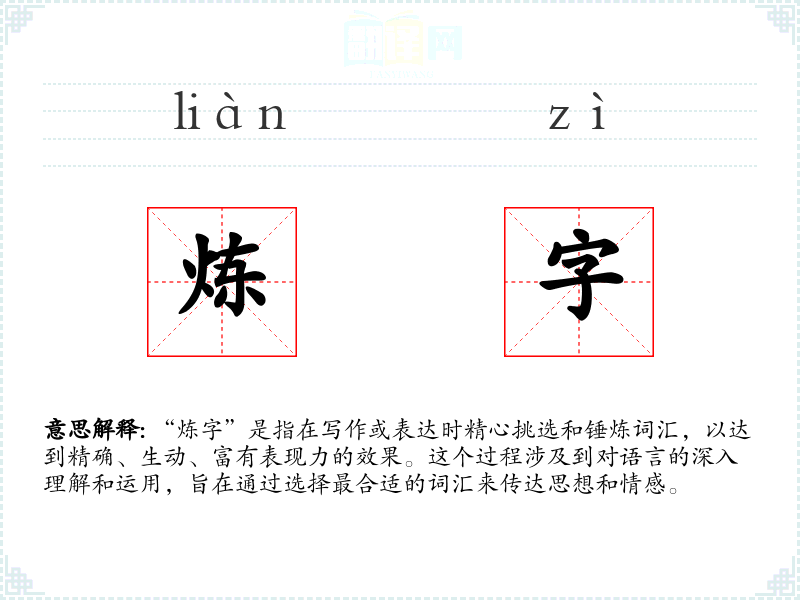 “炼字”是指在写作或表达时精心挑选和锤炼词汇,以达到精确、生动、富有表现力的效果。这个过程涉及到对语言的深入理解和运用,旨在通过选择最合适的词汇来传达思想和情感。