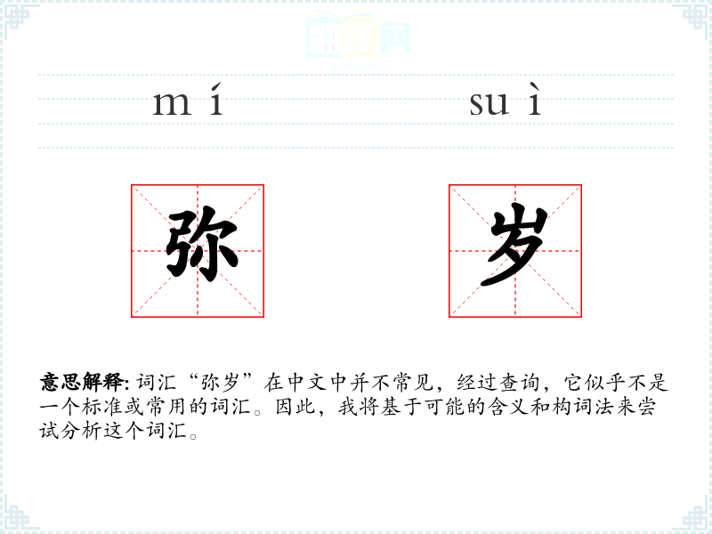 词汇“弥岁”在中文中并不常见,经过查询,它似乎不是一个标准或常用的词汇。因此,我将基于可能的含义和构词法来尝试分析这个词汇。