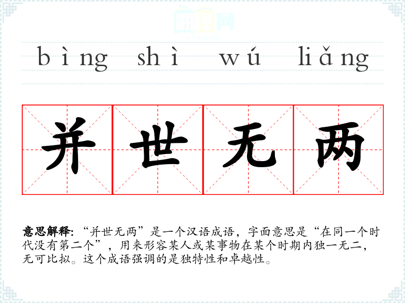 “并世无两”是一个汉语成语,字面意思是“在同一个时代没有第二个”,用来形容某人或某事物在某个时期内独一无二,无可比拟。这个成语强调的是独特性和卓越性。