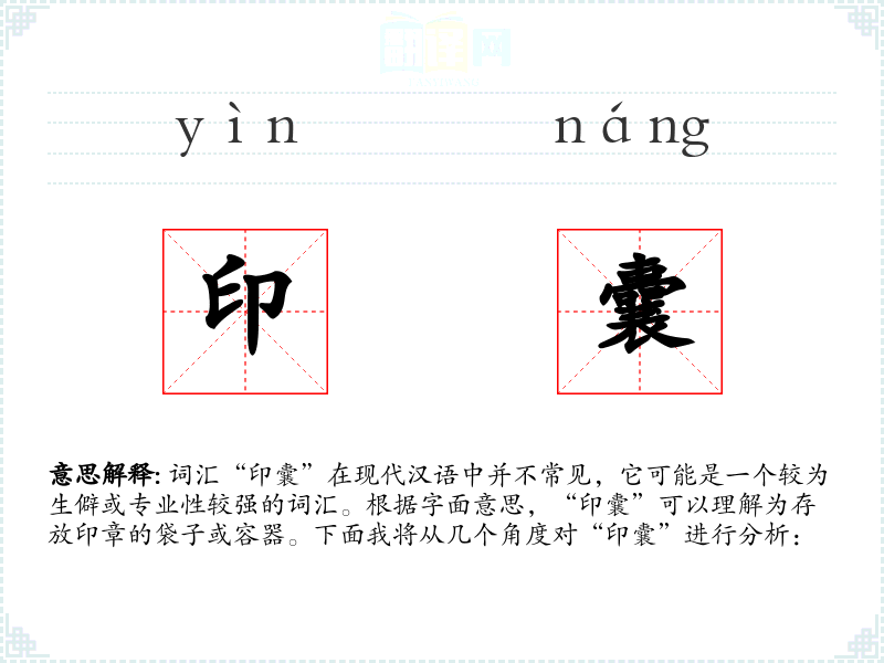 词汇“印囊”在现代汉语中并不常见,它可能是一个较为生僻或专业性较强的词汇。根据字面意思,“印囊”可以理解为存放印章的袋子或容器。下面我将从几个角度对“印囊”进行分析: