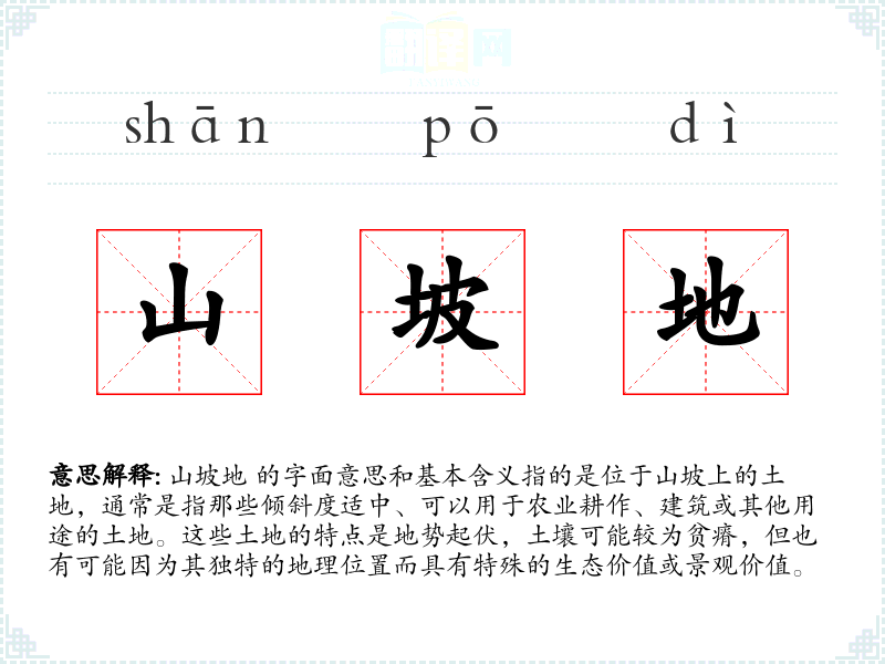 “山坡地”一词由“山”和“坡地”组成,其中“山”指的是高起的自然地形,“坡地”则是指有一定倾斜度的土地。这个词在中文中的使用历史悠久,随着人们对自然环境的认识加深,其含义和用法也在不断丰富和发展。