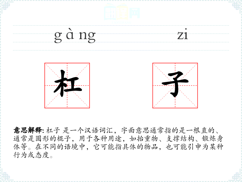 杠子 是一个汉语词汇,字面意思通常指的是一根直的、通常是圆形的棍子,用于各种用途,如抬重物、支撑结构、锻炼身体等。在不同的语境中,它可能指具体的物品,也可能引申为某种行为或态度。