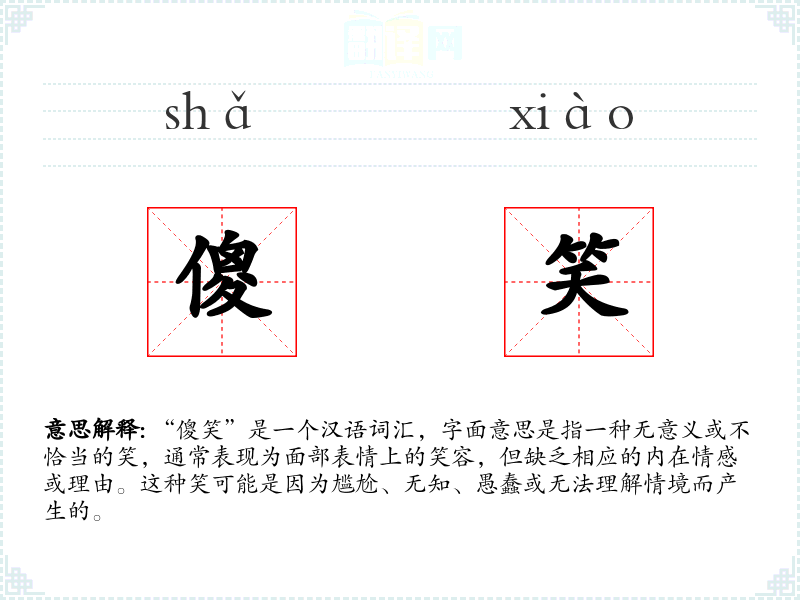 - 反义词:与“傻笑”相对的词汇可能是“微笑”、“欢笑”等,这些词汇通常与积极的情感和适当的情境相关联。