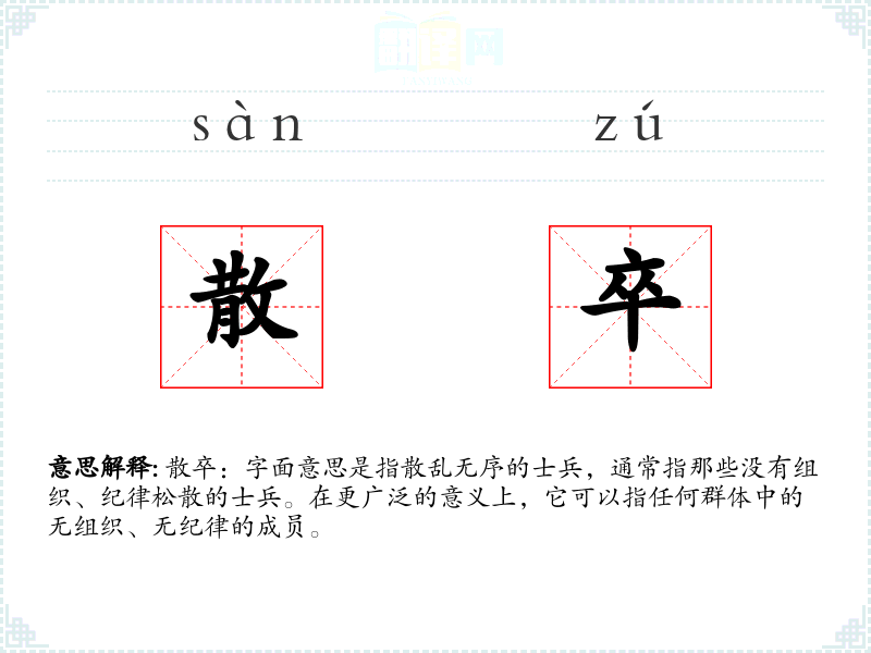 散卒:字面意思是指散乱无序的士兵,通常指那些没有组织、纪律松散的士兵。在更广泛的意义上,它可以指任何群体中的无组织、无纪律的成员。