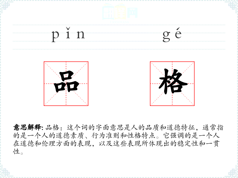 品格:这个词的字面意思是人的品质和道德特征,通常指的是一个人的道德素质、行为准则和性格特点。它强调的是一个人在道德和伦理方面的表现,以及这些表现所体现出的稳定性和一贯性。