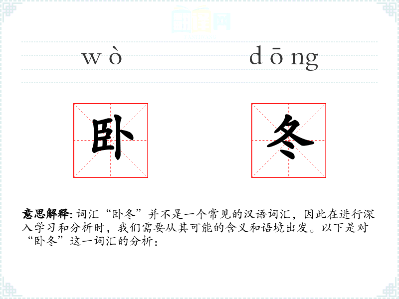 词汇“卧冬”并不是一个常见的汉语词汇,因此在进行深入学习和分析时,我们需要从其可能的含义和语境出发。以下是对“卧冬”这一词汇的分析: