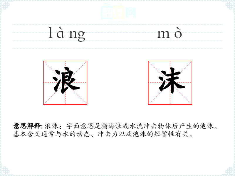 浪沫:字面意思是指海浪或水流冲击物体后产生的泡沫。基本含义通常与水的动态、冲击力以及泡沫的短暂性有关。
