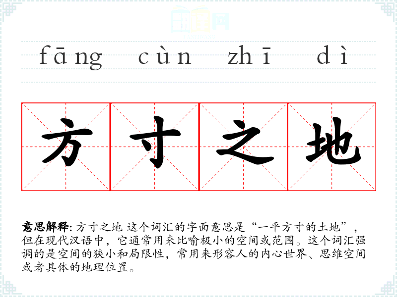 方寸之地 这个词汇的字面意思是“一平方寸的土地”,但在现代汉语中,它通常用来比喻极小的空间或范围。这个词汇强调的是空间的狭小和局限性,常用来形容人的内心世界、思维空间或者具体的地理位置。