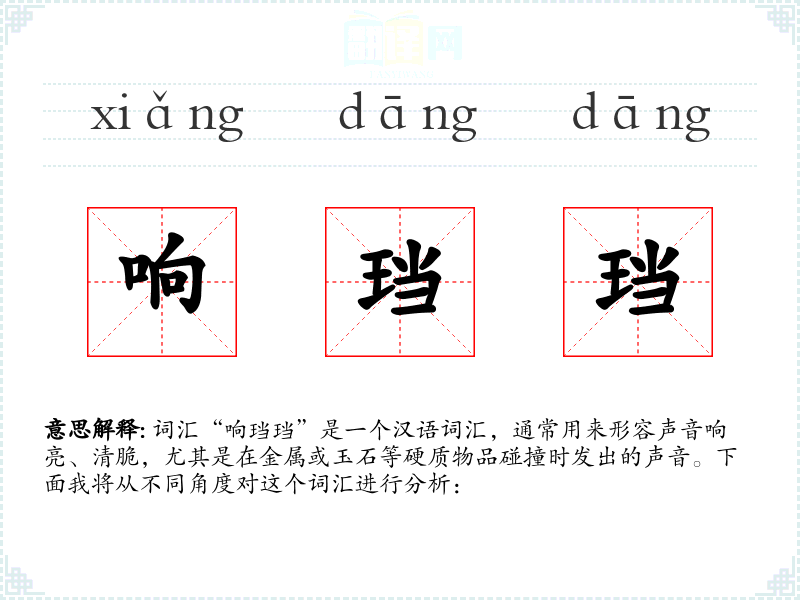 词汇“响珰珰”是一个汉语词汇,通常用来形容声音响亮、清脆,尤其是在金属或玉石等硬质物品碰撞时发出的声音。下面我将从不同角度对这个词汇进行分析: