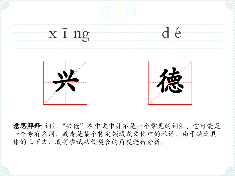 词汇“兴德”在中文中并不是一个常见的词汇,它可能是一个专有名词,或者是某个特定领域或文化中的术语。由于缺乏具体的上下文,我将尝试从最契合的角度进行分析。