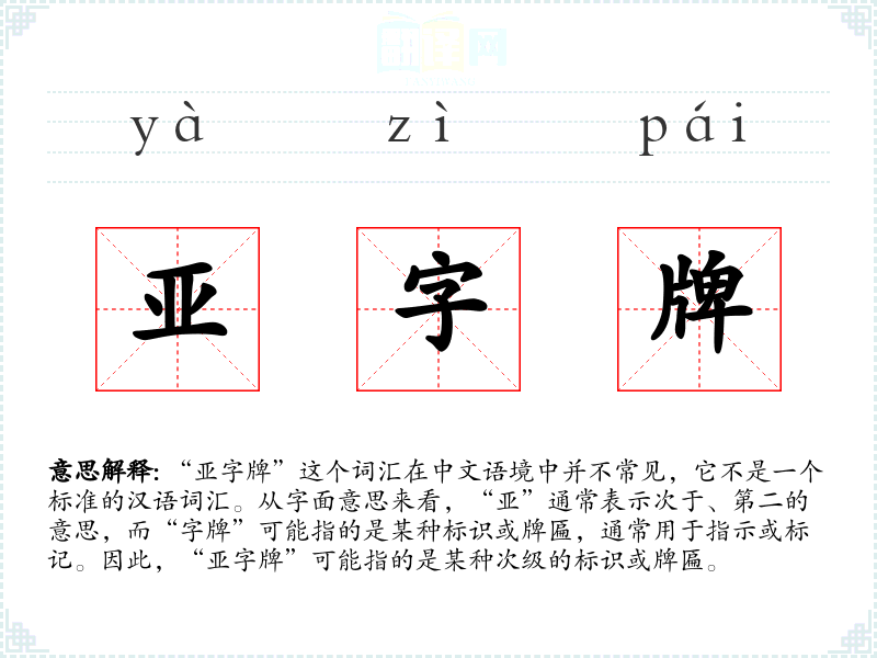 “亚字牌”这个词汇在中文语境中并不常见,它不是一个标准的汉语词汇。从字面意思来看,“亚”通常表示次于、第二的意思,而“字牌”可能指的是某种标识或牌匾,通常用于指示或标记。因此,“亚字牌”可能指的是某种次级的标识或牌匾。