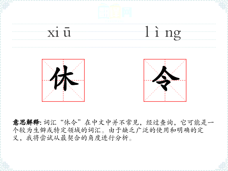 词汇“休令”在中文中并不常见,经过查询,它可能是一个较为生僻或特定领域的词汇。由于缺乏广泛的使用和明确的定义,我将尝试从最契合的角度进行分析。