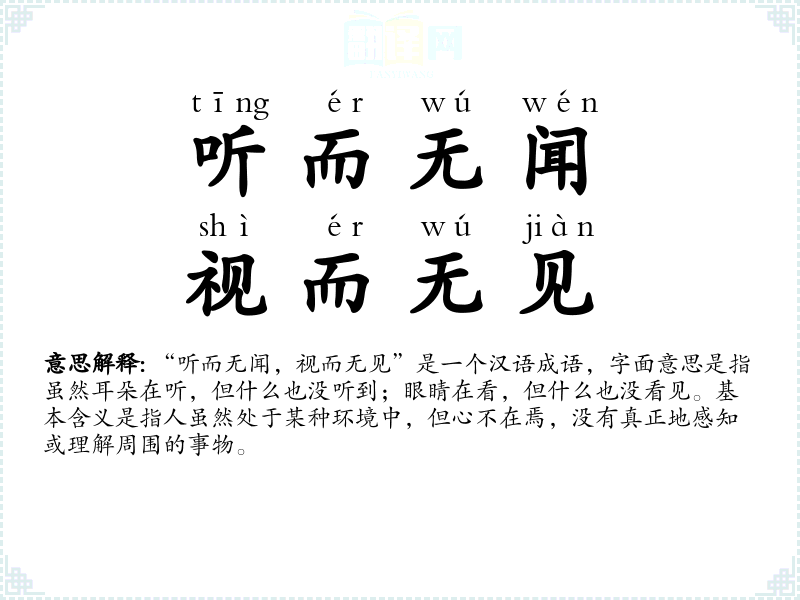 “听而无闻,视而无见”是一个汉语成语,字面意思是指虽然耳朵在听,但什么也没听到;眼睛在看,但什么也没看见。基本含义是指人虽然处于某种环境中,但心不在焉,没有真正地感知或理解周围的事物。