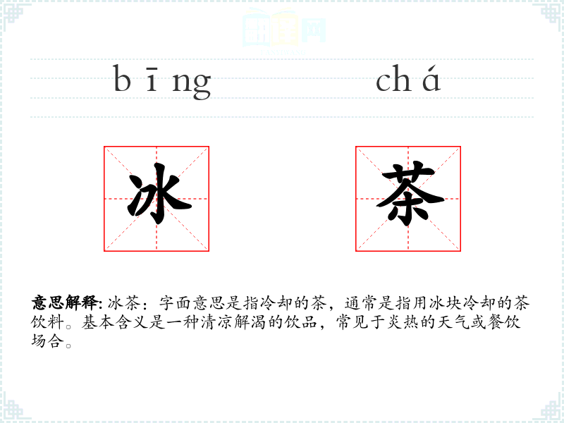 冰茶:字面意思是指冷却的茶,通常是指用冰块冷却的茶饮料。基本含义是一种清凉解渴的饮品,常见于炎热的天气或餐饮场合。