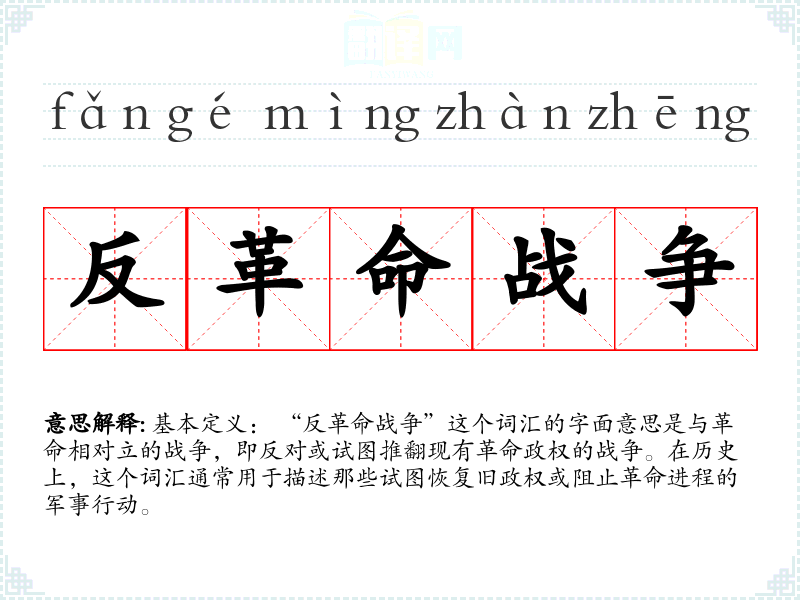 同义词与反义词: 同义词可能包括“反叛战争”、“复辟战争”,而反义词则是“革命战争”。这些词汇在强调的立场和目标上有所不同,但都涉及到政治变革的军事行动。