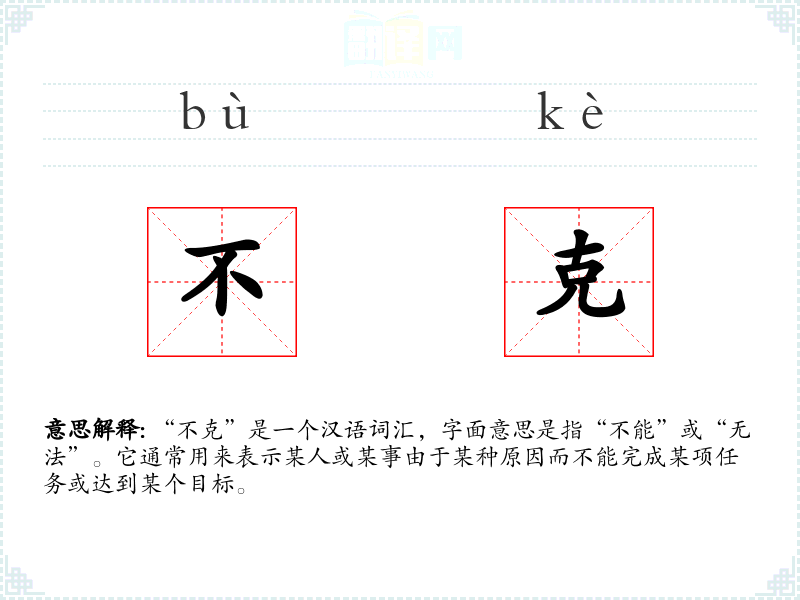 “不克”是一个汉语词汇,字面意思是指“不能”或“无法”。它通常用来表示某人或某事由于某种原因而不能完成某项任务或达到某个目标。