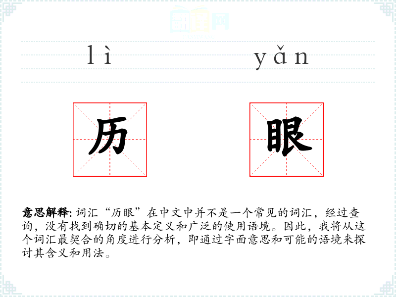 词汇“历眼”在中文中并不是一个常见的词汇,经过查询,没有找到确切的基本定义和广泛的使用语境。因此,我将从这个词汇最契合的角度进行分析,即通过字面意思和可能的语境来探讨其含义和用法。