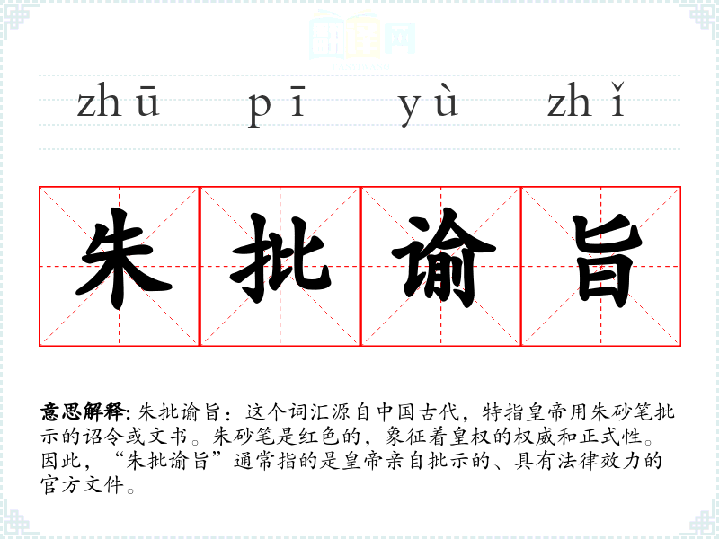 朱批谕旨:这个词汇源自古代,特指用朱砂笔批示的诏令或文书。朱砂笔是红色的,象征着皇权的权威和正式性。因此,“朱批谕旨”通常指的是**亲自批示的、具有法律效力的官方文件。
