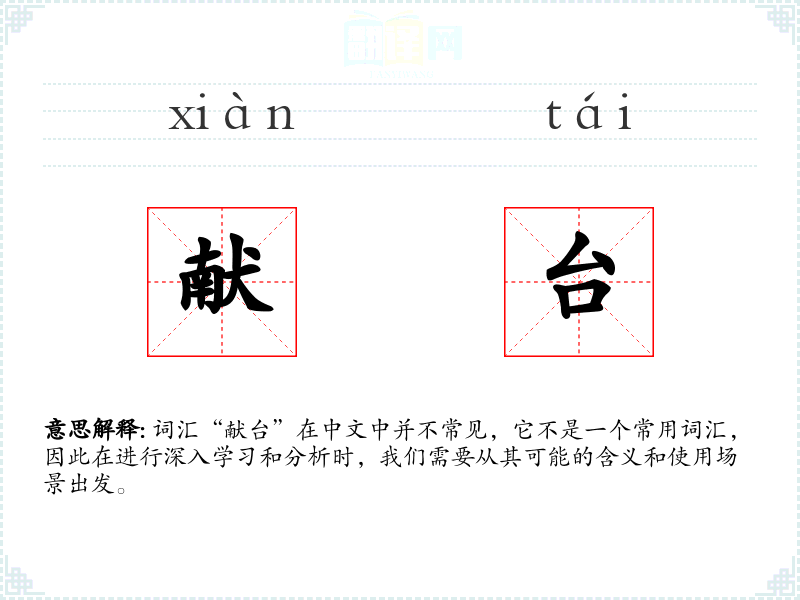 词汇“献台”在中文中并不常见,它不是一个常用词汇,因此在进行深入学*和分析时,我们需要从其可能的含义和使用场景出发。