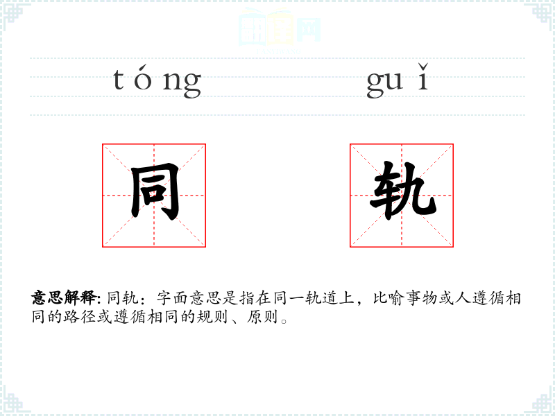 同轨:字面意思是指在同一轨道上,比喻事物或人遵循相同的路径或遵循相同的规则、原则。