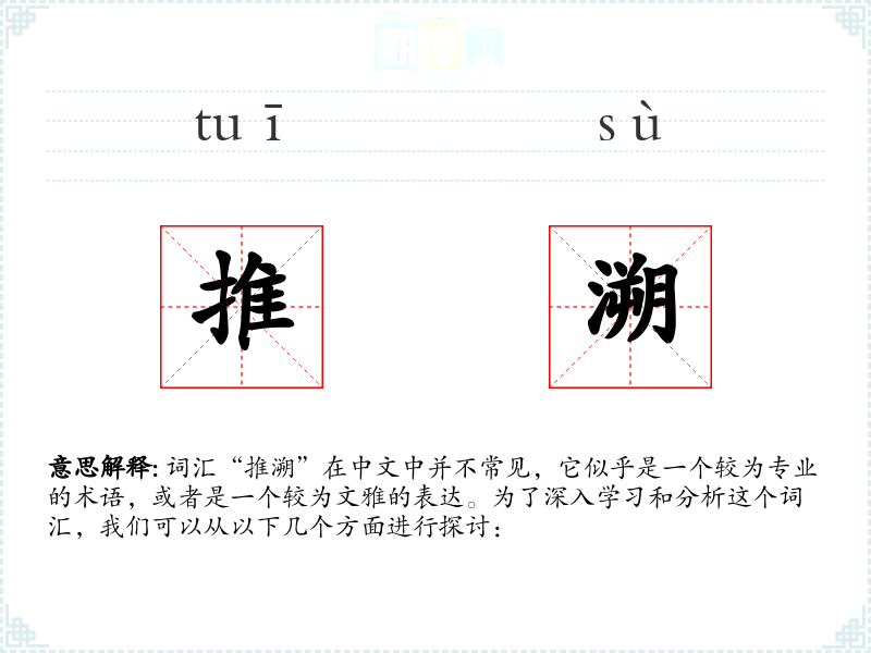 词汇“推溯”在中文中并不常见,它似乎是一个较为专业的术语,或者是一个较为文雅的表达。为了深入学*和分析这个词汇,我们可以从以下几个方面进行探讨: